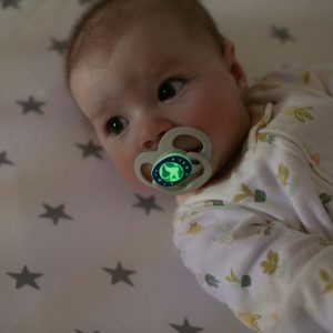 A fully symmetrical soother. with reversible bulb that fits in baby’s mouth either right-side up or upside down – and glows in the dark to easily find.