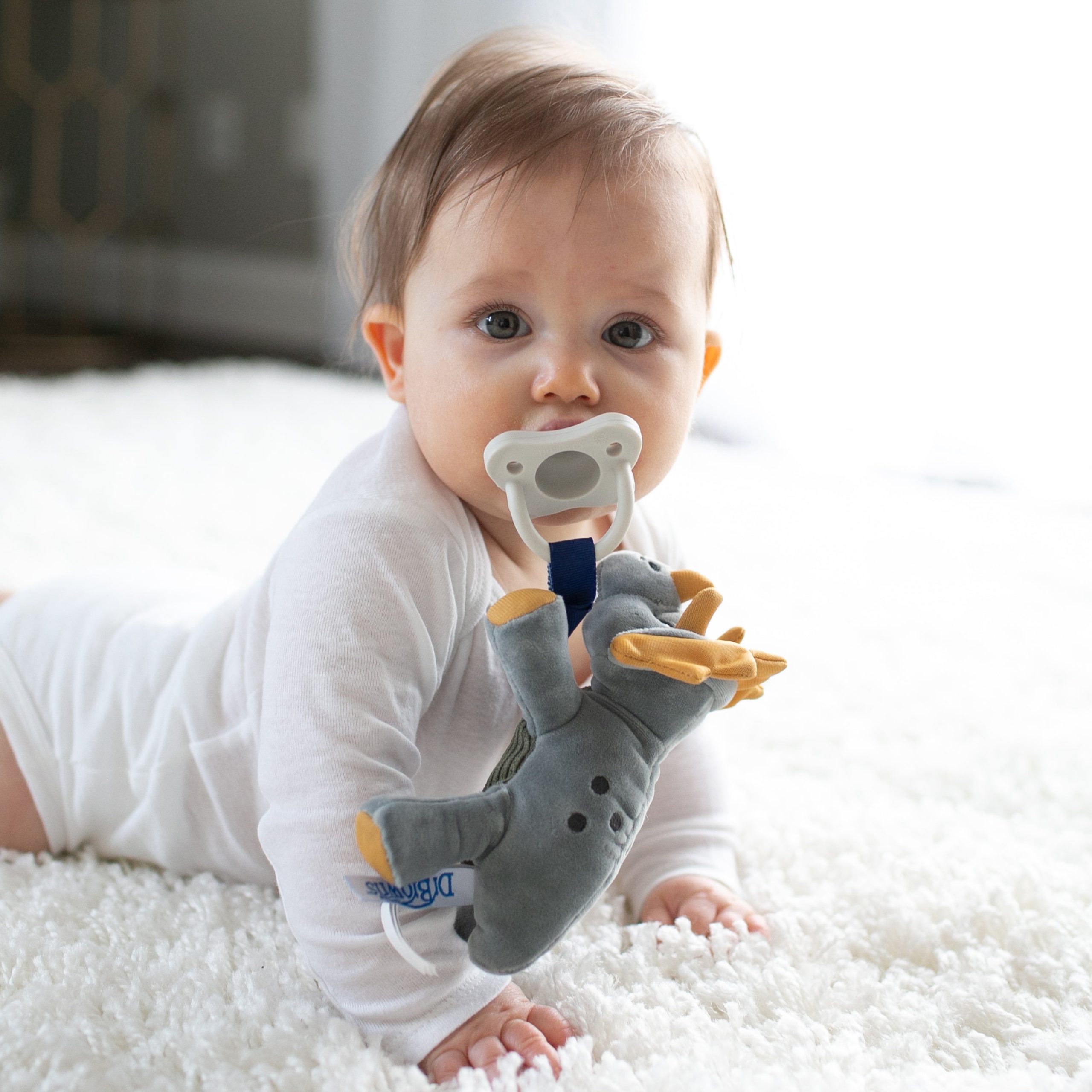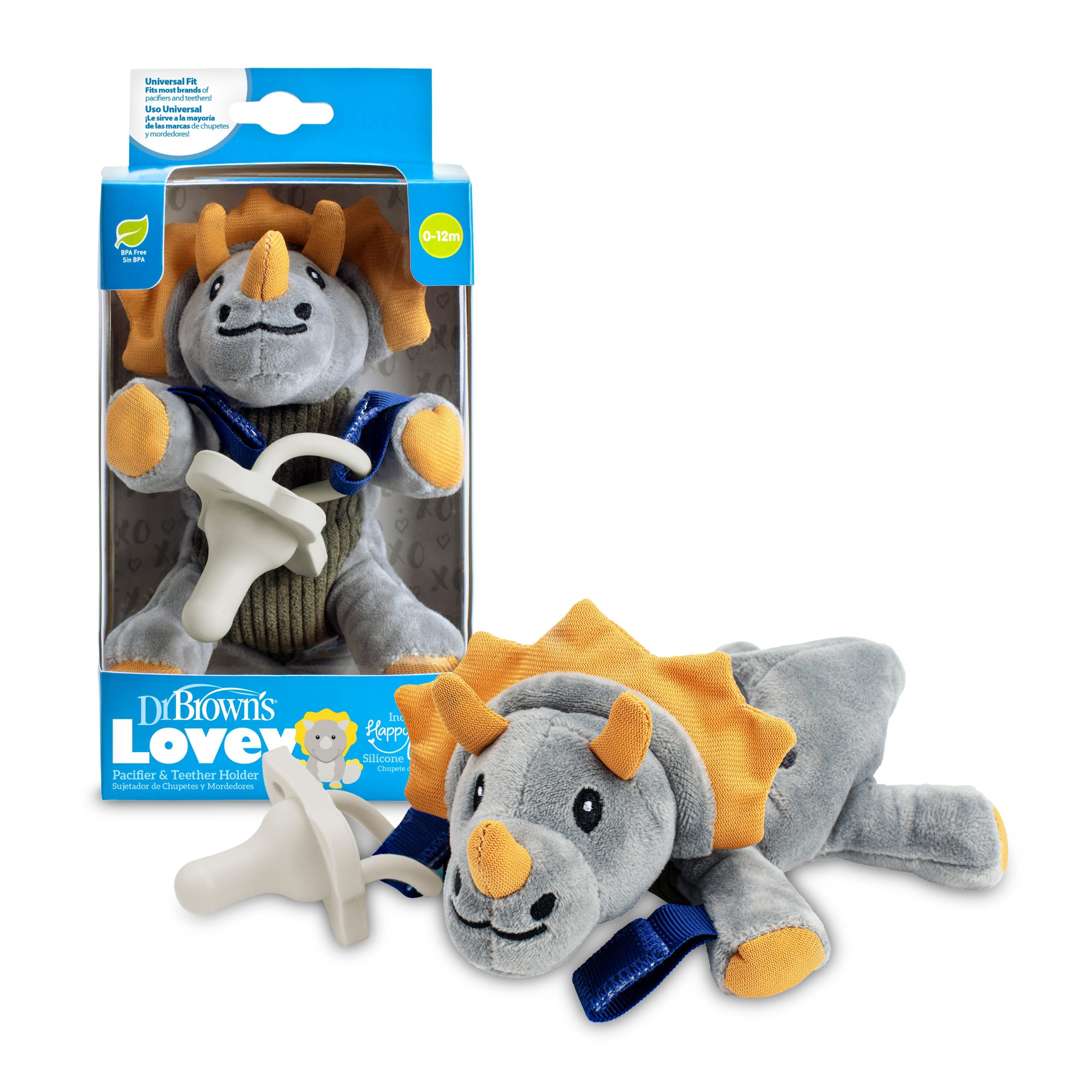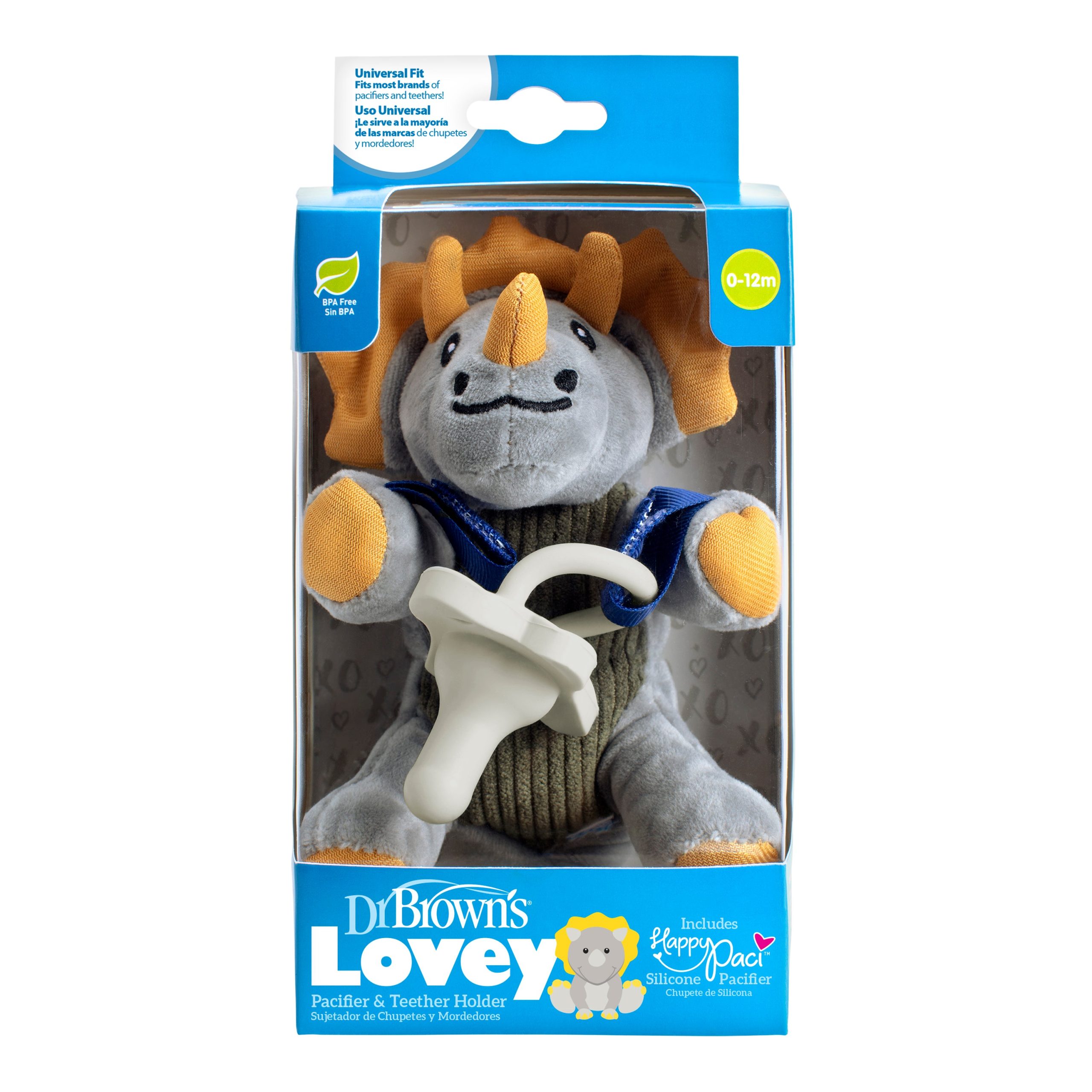 - Lovey securely holds most pacifiers and teethers and includes a 100% silicone Dr. Brown’s® HappyPaci™ pacifier