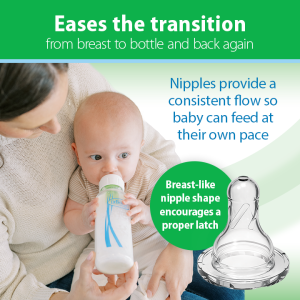 • Breast-like nipple shape encourages a proper latch and provides a consistent flow so babies feed at their own pace