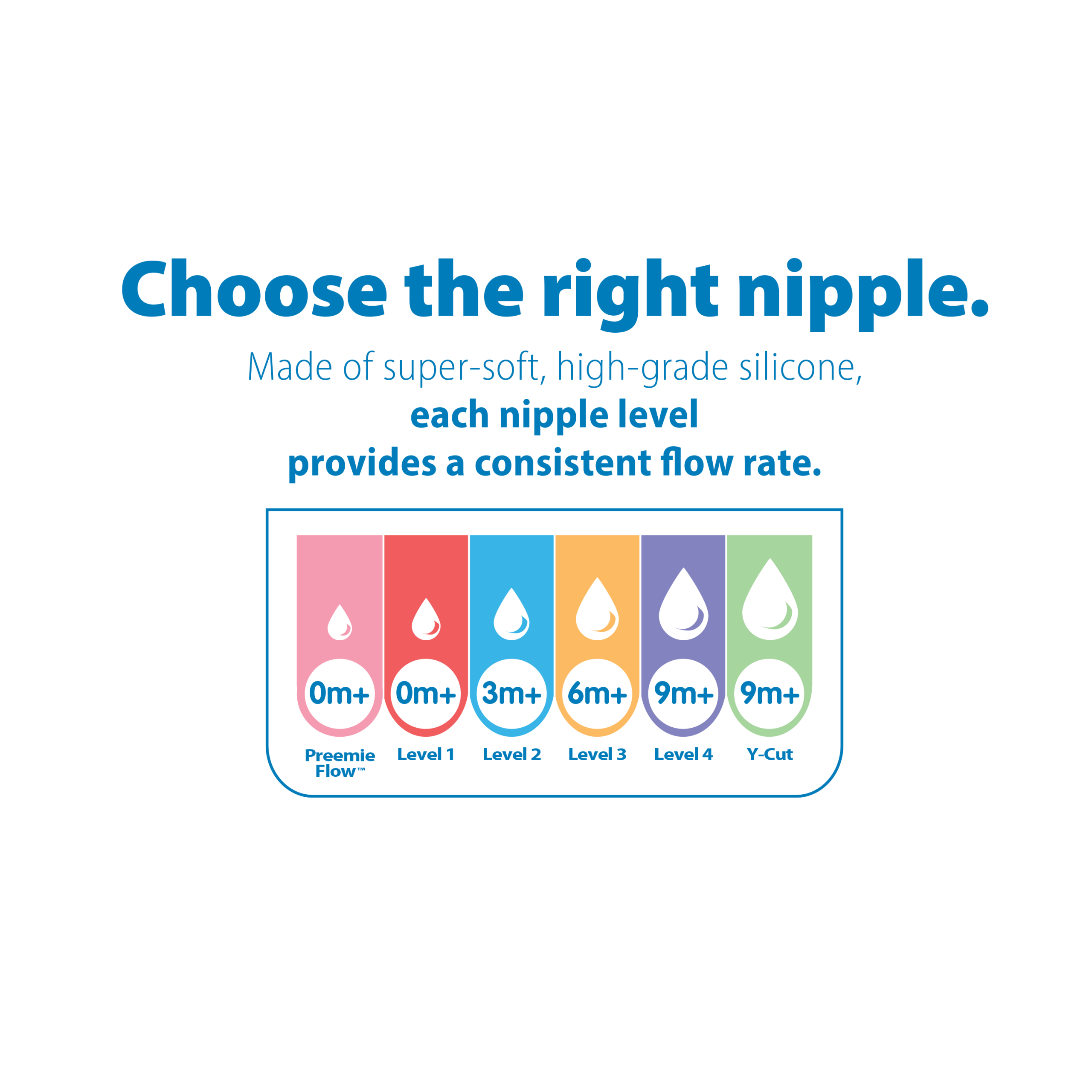 • 6 different nipple flow levels. from 0m+ – to 9m+ – to thicker liquids. Baby’s preferred flow rate may vary from the suggested age range